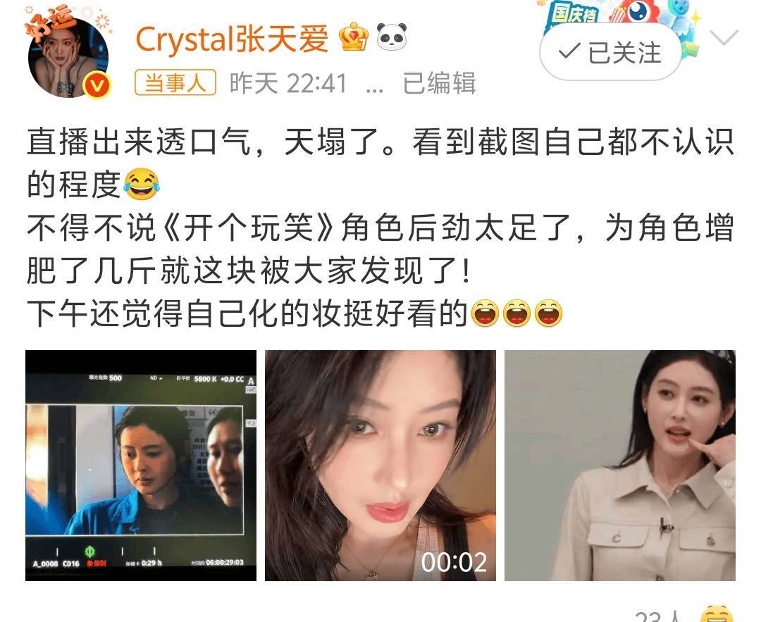面对争议,张天爱深夜发文幽默回应:“直播出来透口气,天塌了!看到截图自己都不认识的程度,不得不说《开个玩笑》角色后劲太足,增肥几斤就被大家发现了!”她透露正在拍摄新电影《开个玩笑》,为饰演底层环卫女工季红主动增肥,体重从83斤增至96斤,打破多年“纸片人”形象。